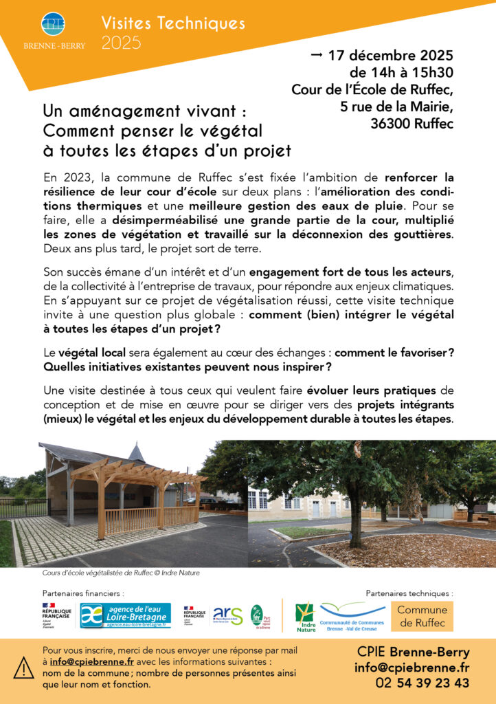La prochaine visite technique organisée par le CPIE Brenne-Berry aura lieu à Ruffec (36300), sur la thématique de l’intégration du végétal dans un projet et du végétal local, en s’appuyant sur la cour de l’école de Ruffec.